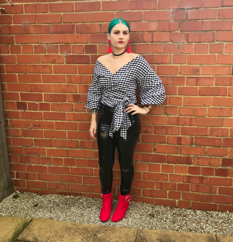 I teamed them with another bargain I got from Pretty Little Thing, again I can’t remember how much it was but I got it in the sale and it was less than a 10er. It’s this fab gingham check shirt/top, it wraps around the body and ties in a big bow on the side. I must admit I got in a bit of a tangle trying to work out how it fastened and I’m still not sure I didn’t it properly, but it looks like it’s right atleast. It also sits slightly off the shoulders which I love and is in a quite thick flannel type material, so it’s actually quite warm and good for this time of year. It also has really puffy ruched sleeves which are a really nice detail. As you may have also noticed I’m loving Red right now, so I added a splash of colour by accessorising with my fave earrings at the moment, these red tassel ones and some red suede effect boots. Finishing off with a thin velvet choker and a gold chain choker.